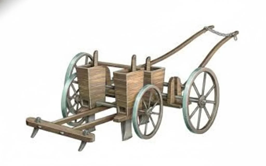Earlier in his life, Tull had once dismantled a pipe-organ, and the application of the technology behind this musical instrument inspired him to devise a drill that would distribute precise amounts of seed into pre-cut channels. Basic seeding devices had been known for almost 2000 years, but Tull took the concept a stage further. In his device, as the main wheels of the drill turned, the cylinder rotated against a spring-held tongue. This allowed seed to pass evenly from the hopper above to a funnel below. From here, the seed was directed at regular intervals into three channels, or furrows, in the earth. These were dug to a specific depth by the blades at the front of the machine. Spikes at the back of the machine then turned the soil over to immediately cover the seeds. Tull’s ‘seed drill’ would limit the wastage of seed, and as the seedlings grew in uniform rows, it would also make it easier to remove any unwanted weeds growing among the crop. Accordingly, each plant would have more space to grow, and although there would be fewer plants, the net yield would be greater.